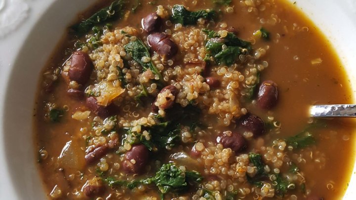 Simmer already-cooked beans and quinoa in broth, throw in a big handful of kale, add a nice layer of heat (plus a surprising ingredient) and you’ve got a quick, delicious, and healthy low-fat soup. A great meatless option for vegans, vegetarians, and thrifty Trim Healthy Mamas.