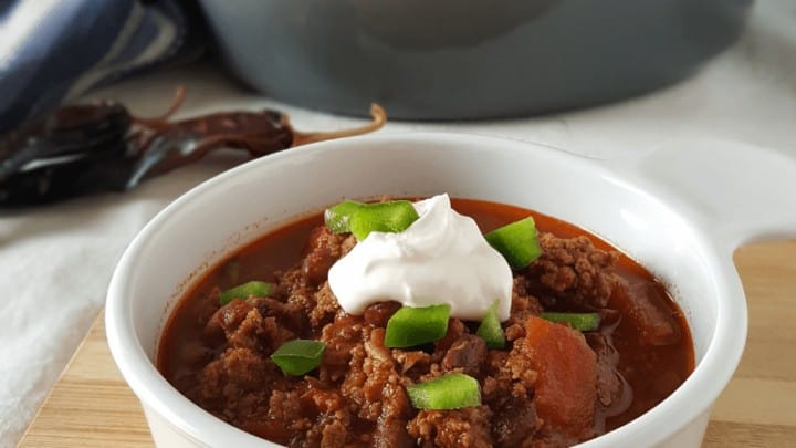 Slow-baked in a French oven, this braised chipotle chili will fill your home with savory aromas and your belly with warming comfort. It’s perfect for chilly days that beg for hoodies, hot beverages, and snuggly blankets. Trim Healthy Mamas can make this to suit S (low carb) or E (low fat) Fuel Types, making it a versatile family-pleasing dish.