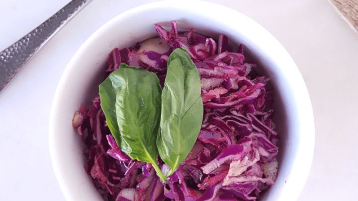 Deep, rich colors in fruits and veg mean more antioxidants, did you know that? That’s why I’ve chosen red cabbage for this delicious sweet and tangy Raspberry Basil Coleslaw. Featuring my easy 5 minute Raspberry Basil Vinaigrette Dressing it’s perfect for Trim Healthy Mamas, keto and low carb dieters, and diabetics.