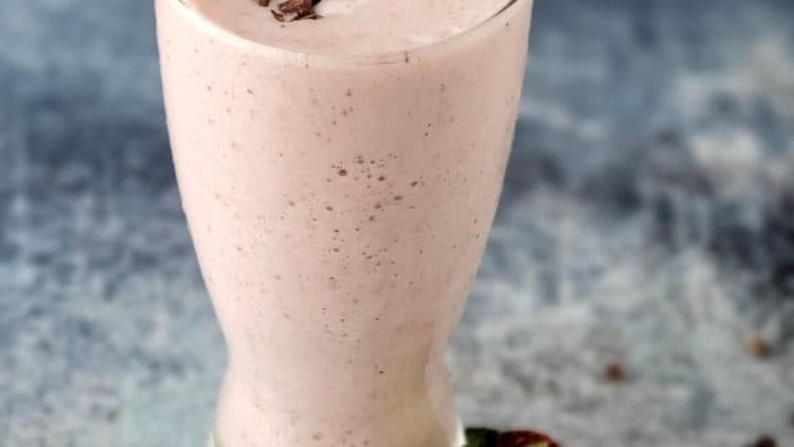 Light, fruity, and with pops of dark chocolate this delicious chocolate covered strawberry smoothie makes a perfect light dessert or snack. Add a full scoop of protein powder or collagen for a quick meal on busy days.