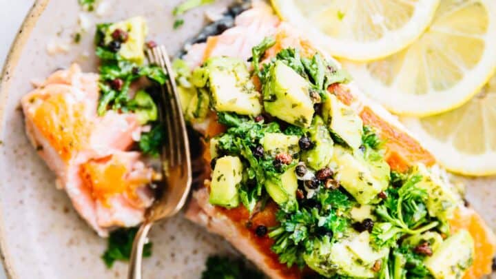 Pan Seared Salmon with Avocado Gremolata is a Whole30 compliant, healthy fish recipe. Making this crispy skin salmon requires just 7 ingredients and 10 minutes of cooking time! This is a quick, easy, kid-friendly