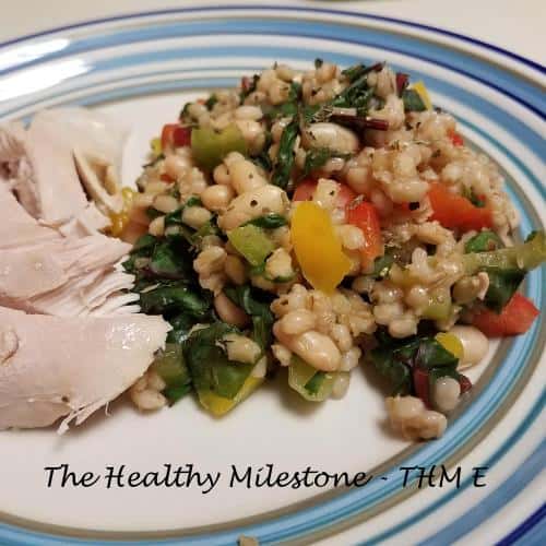 Low fat, gentle-on-blood-sugar barley, northern beans, multicolored peppers, and deep, green Swiss chard come together in low fat broth for a delicious, nutritious THM E side dish.